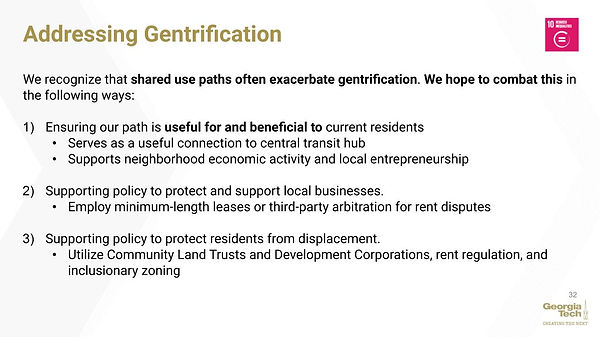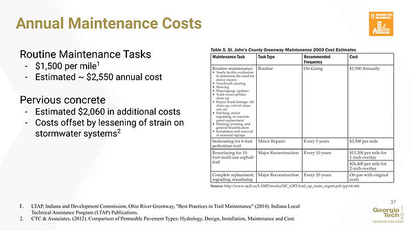 Based on our analysis of a proposed Model Mile trail section in the city of East Point (PATH Foundation, 2016), we estimate that the total cost of implementing the greenway will be $2.5 million. The range of costs could be as low as $2 million and as high as $3 million. The figure below shows the breakdown of costs for one of the sections of the East Point trail. This section of trail is slightly shorter than the proposed greenway, which is why the estimated cost of our greenway is slightly higher than the trail proposed below. This relatively low cost addresses SDG 11: Sustainable Cities and Communities.